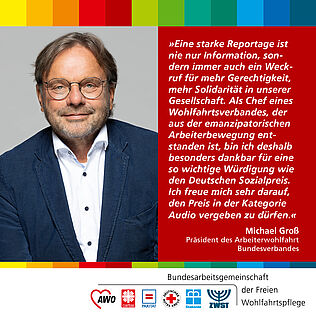 „Eine starke Reportage ist nie nur Information, sondern immer auch ein Weckruf für mehr Gerechtigkeit, mehr Solidarität in unserer Gesellschaft. Als Chef eines Wohlfahrtsverbandes, der aus der emanzipatorischen Arbeiterbewegung entstanden ist, bin ich deshalb besonders dankbar für eine so wichtige Würdigung wie den Deutschen Sozialpreis. Ich freue mich sehr darauf, den Preis in der Kategorie Audio vergeben zu dürfen."