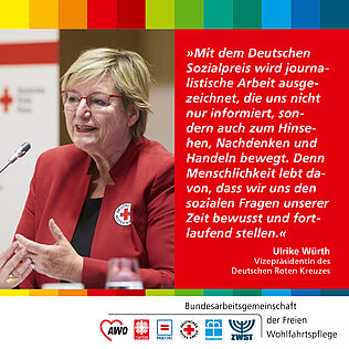 „Der Deutsche Sozialpreis wird seit 1971 verliehen. Gerade in Zeiten wie diesen brauchen wir dringend mutigen Journalismus, der soziale Missstände aufdeckt. Mittelknappheit und das Erstarken autoritärer Kräfte stellen sowohl die Wohlfahrt als auch den Journalismus vor große Herausforderungen. Umso mehr freue ich mich, dass es den Deutschen Sozialpreis und engagierten Journalismus gibt.“