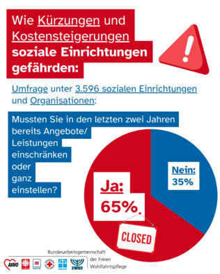 Mehr als zwei Drittel der Befragten gaben an, dass sie in den vergangenen beiden Jahren auf Grund von Kostensteigerungen und/oder Kürzungen Angebote eingeschränkten oder ganz einstellen mussten. Der Anteil der Einrichtungen und Dienste mit vollständig eingestellten Angeboten stieg im Vergleich zu einer Umfrage Mitte 2024 von 14,7 % auf 20 %.